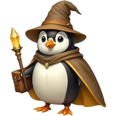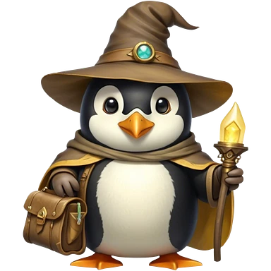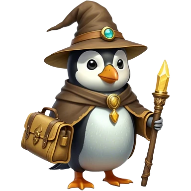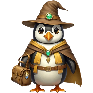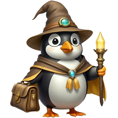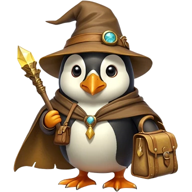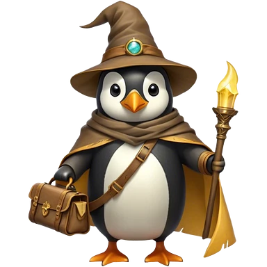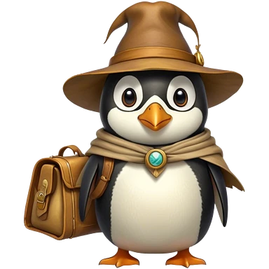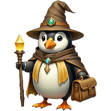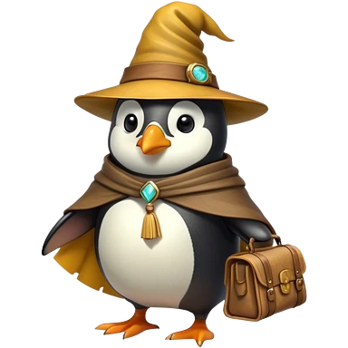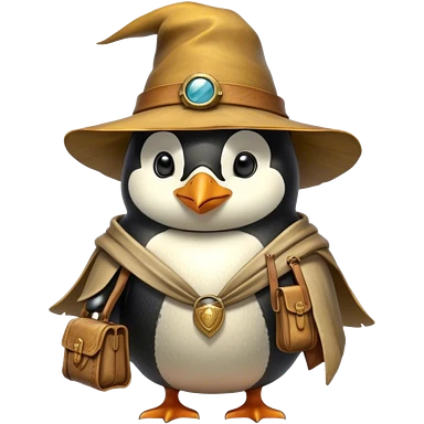 A wizard-explorer penguin inspired by Indiana Jones, wearing a weathered yellow enchanted hat and a flowing cape. It carries a leather satchel with ancient scrolls and holds a glowing magical relic. Cartoon-style, smooth shading, highly detailed, no background emoji