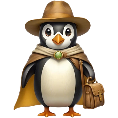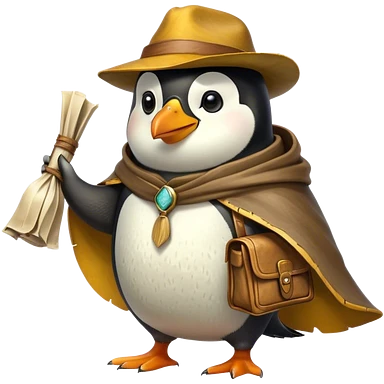 A explorer penguin inspired by Indiana Jones, wearing a weathered yellow enchanted hat and a flowing cape. It carries a leather satchel with ancient scrolls. Cartoon-style, smooth shading, highly detailed, no background emoji