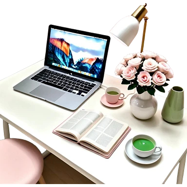 seeing a working from home desk from above with a macbook computer, fashion/interior magazines, flowers in a little vase, louis poulsen portable lamp with a dimmed cozy light and a iced matcha. very girly aesthetic emoji