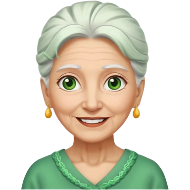 abuela con ojos verdes, pelo blanco, pelo blanco y amarrado, aspecto feliz, pelo blanco, no verde, solo verde los ojos emoji