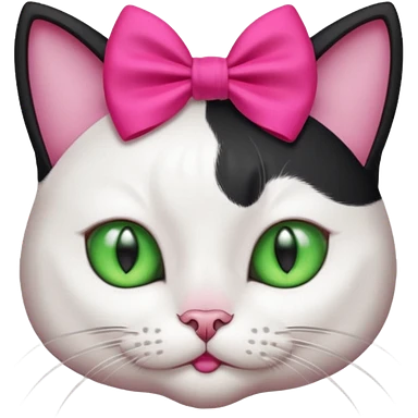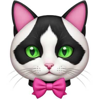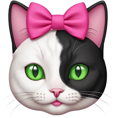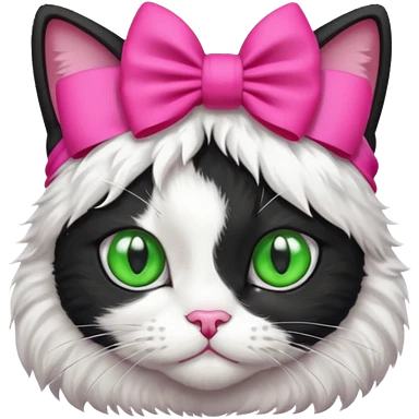 A black and white cat with green eyes she has a hot pink bow on her head emoji