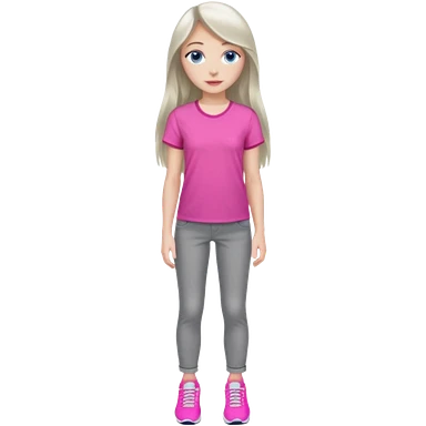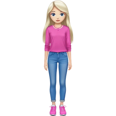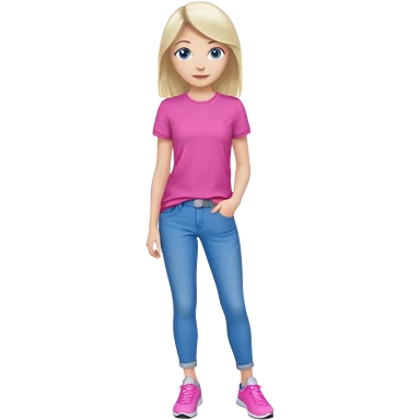 beautiful girl with long fair hair, blue eyes, in a vivid pink blouse, grey jeans and white trainers emoji