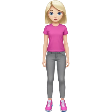 beautiful girl with fair hair, blue eyes, in a vivid pink shirt, grey jeans and white trainers emoji