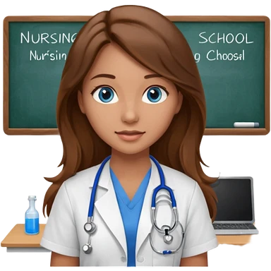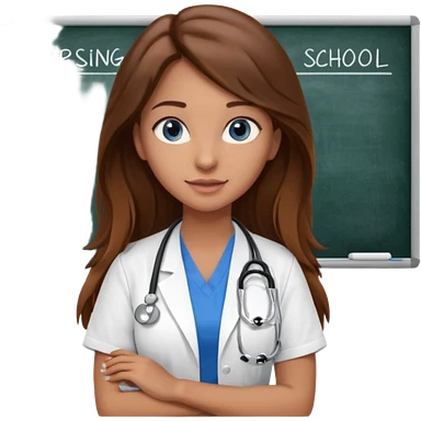 inside a classroom at university that says nursing school on the board with a pretty female nursing student with long brown hair, blue eyes emoji | AI Emoji Generator
