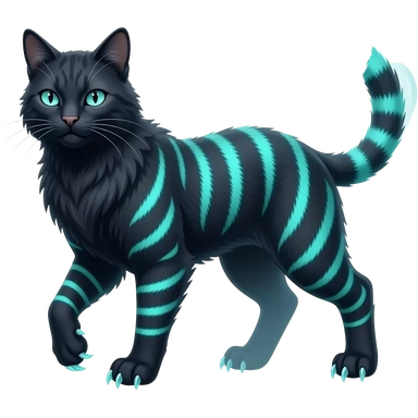 Pitch black, with neon-cyan bulbs and glowing eyes Insomnya-Abyssal-Lykoi-Panther-animal-fantasy-hybrid-creature emoji
