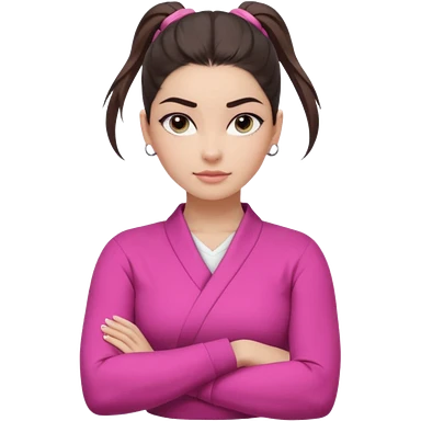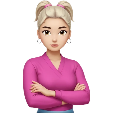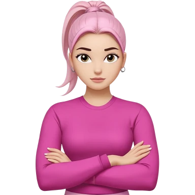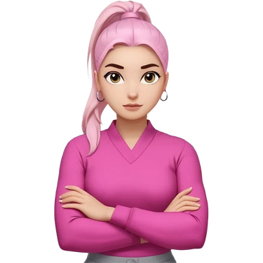 Character: Go-getter, confident, intelligent, composed Emoji Look: Light gray eyes, very noticeable Well-shaped eyebrows, strong appearance Upper ponytail Street fashion look Fair skin with a pink undertone Arms crossed pose Feeling: Girl Boss, cool beauty, minimal but powerful emoji