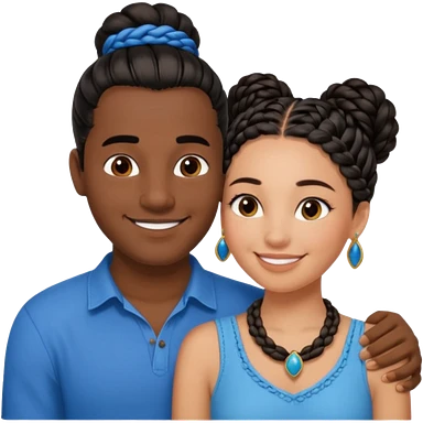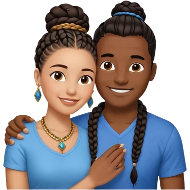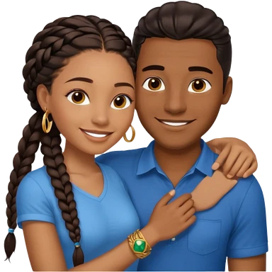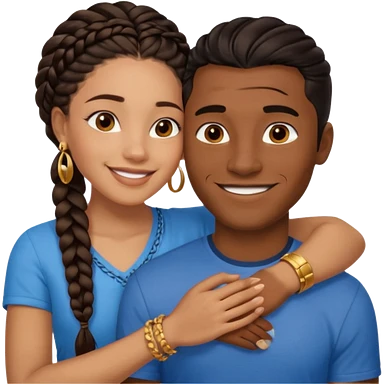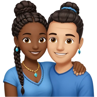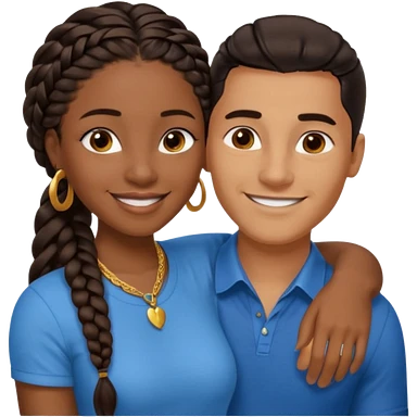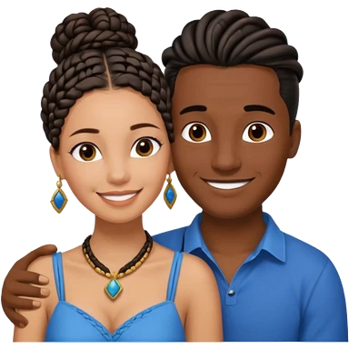 smiling embracing interracial couple from waihair in a bunn in a bunst up. dark ebony woman with long braided hair and jewelry. brazillian man short hair wearing blue. emoji