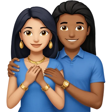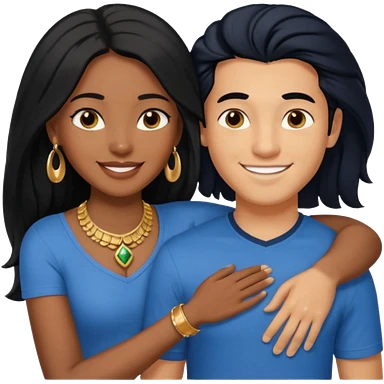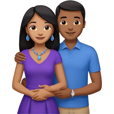 smiling embracing interracial couple. man is tan and has brown straight hair he is wearing blue. woman has very dark color skin and long black hair. she is wearing purple and has matching blue jewelry on emoji