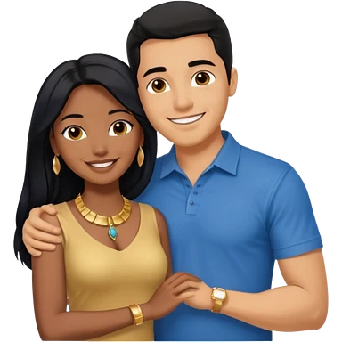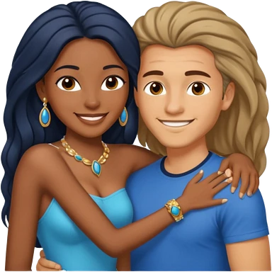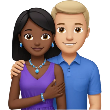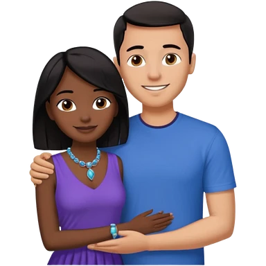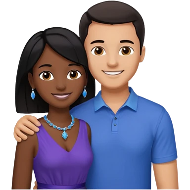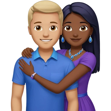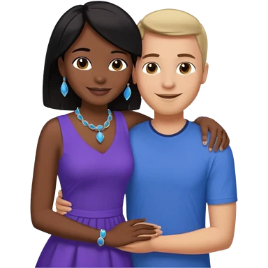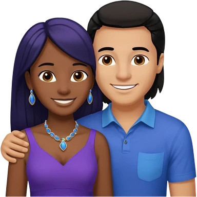 smiling embracing interracial couple. man is tan and has short brown straight hair he is wearing blue. woman has very dark black skin and long dark black hair. she is wearing purple and has matching blue jewelry on emoji