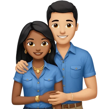 smiling embracing interracial couple from waist up. ebony woman with long hair and jewelry. brazillian man short hair wearing blue. emoji
