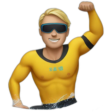 ork female holding small yellow bodyboard, running through shallow turquoise waves, muscular green body, bright floral bikini, fierce joyful grin showing tusks, long wet dark hair splashing, foam and spray, minimalist beach and ocean background, centered emoji, vibrant summer colors, sticker style emoji