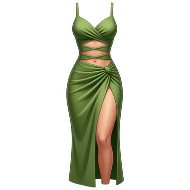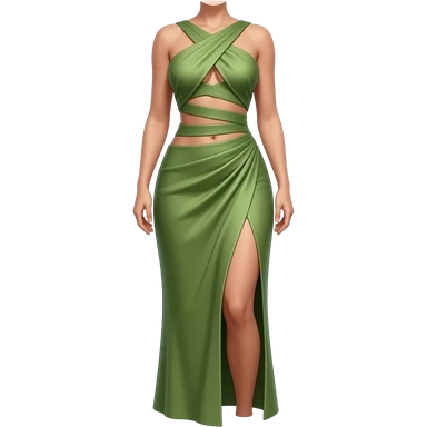 iOS style highly editorial and sculptural A draped olive green wrap dress with multiple abdominal cutouts, a high leg slit decal sticker emoji