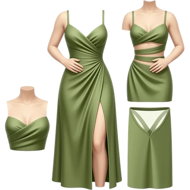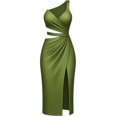 iOS style highly editorial and sculptural A draped olive green wrap dress with multiple abdominal cutouts, a high leg slit emoji