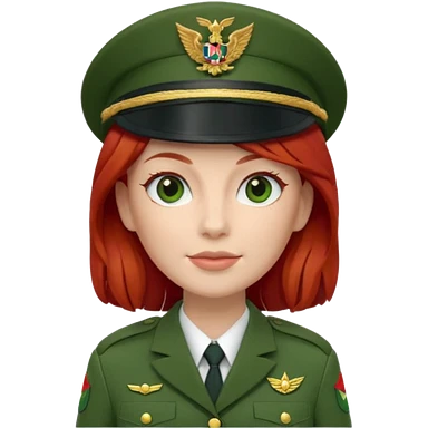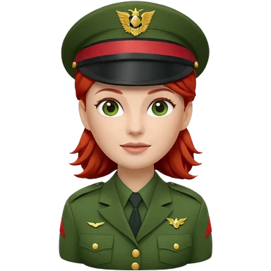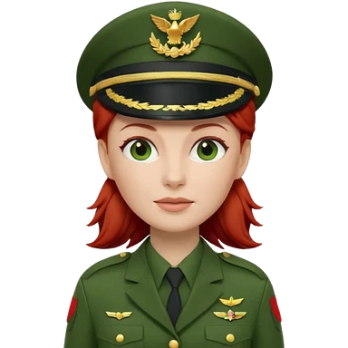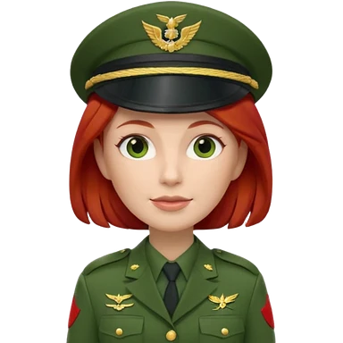 iOS Memoji style, white woman, red hair, green military officer uniform, peaked cap, 3D render, white background. emoji