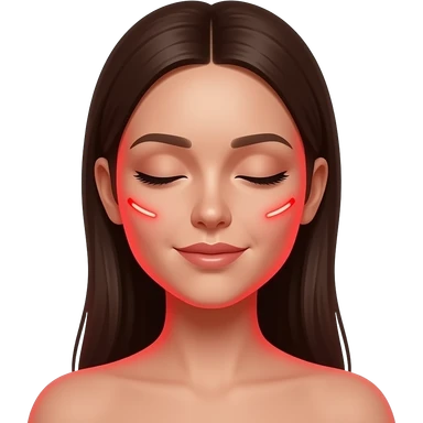 iPhone emoji style illustration of a relaxed woman receiving red light therapy, soft facial expression, glowing red light illuminating her face, smooth skin, minimalistic, glossy 3D emoji style, soft shadows, high detail, centered composition, isolated on pure white background, no text emoji