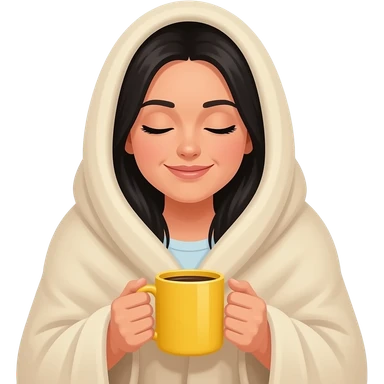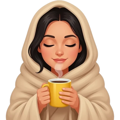 Iphone emoji style, a white woman with black hair, with a large beige blanket, drinking coffee in a yellow mug, cozy and peace emoji