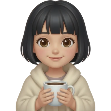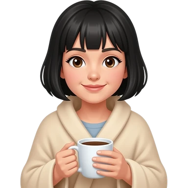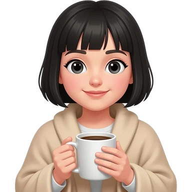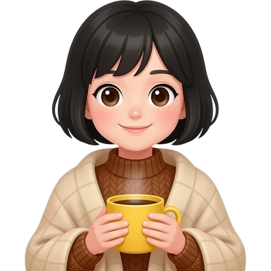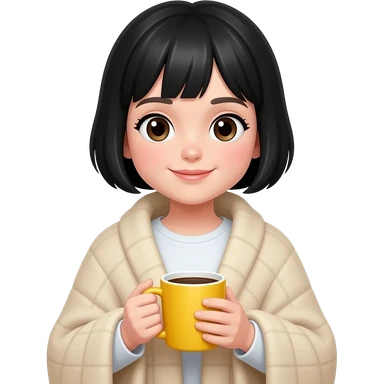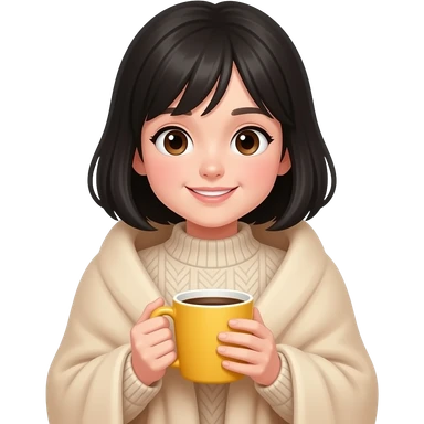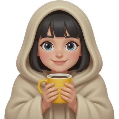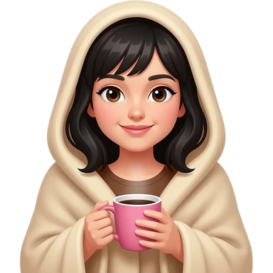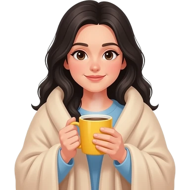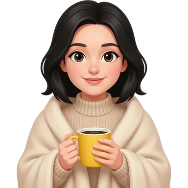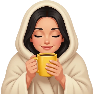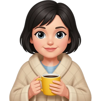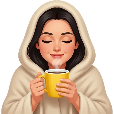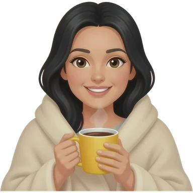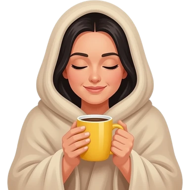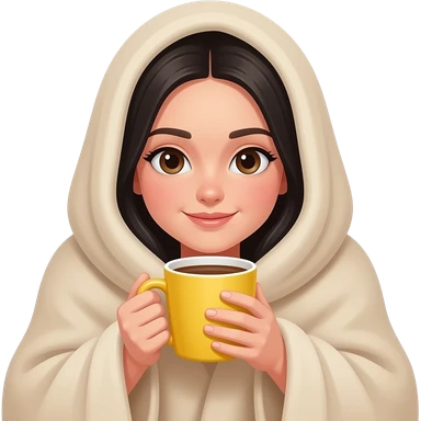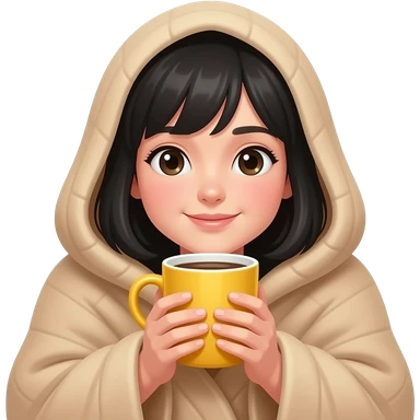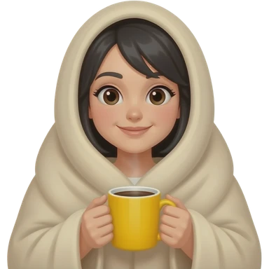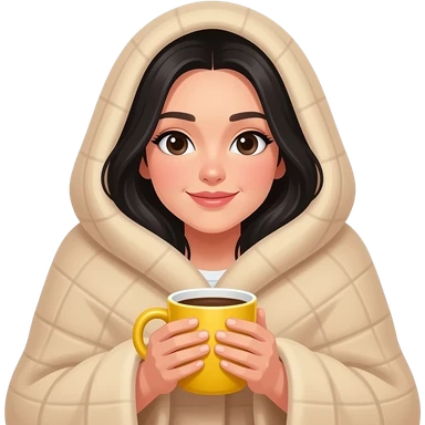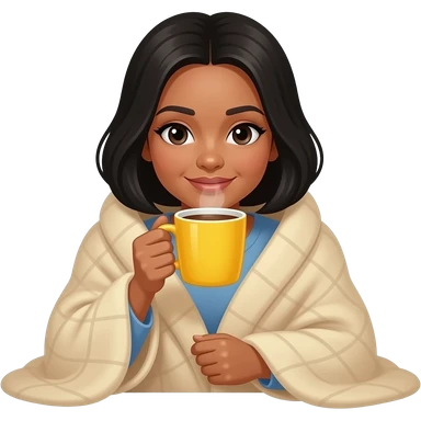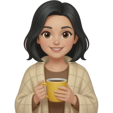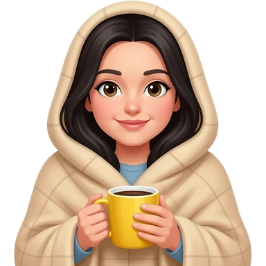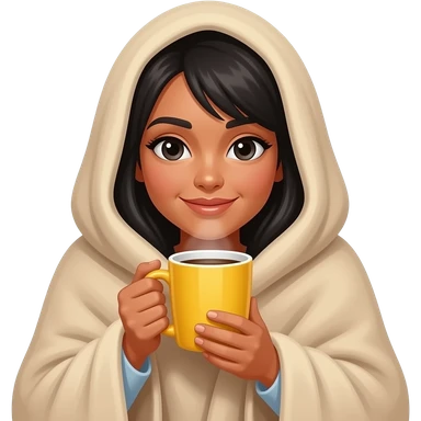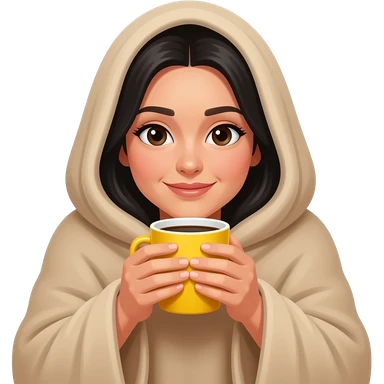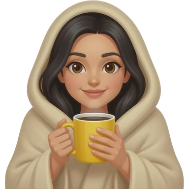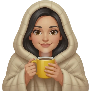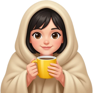 Iphone emoji style, a white woman with black hair, with a large beige blanket, drinking coffee in a yellow mug, cozy and peace emoji | AI Emoji Generator