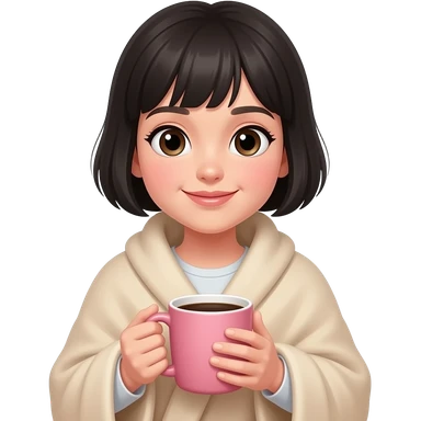 A white girl with short black hair, with a beige blanket and a coffee in a very cozy pink mug, in iPhone emoji style emoji