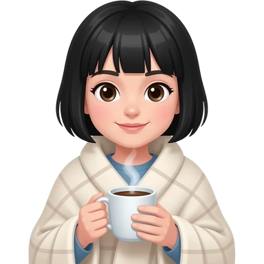 A white girl with short black hair, with a beige blanket and a very cozy coffee, in iPhone emoji style emoji