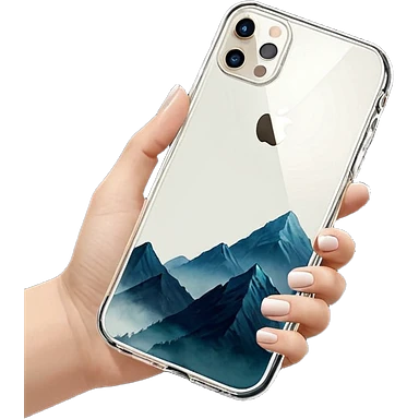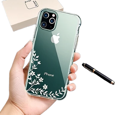 женская рука с нюдовым маникюром (5 пальцев) держит белый айфон в тёмно-зелёном чехле, минимализм, вид под углом emoji