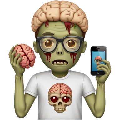 iPhone zombie emoji with a decayed brain, glasses, and a t shirt that says « braindead » emoji | AI Emoji Generator
