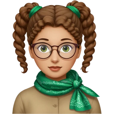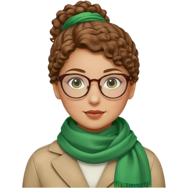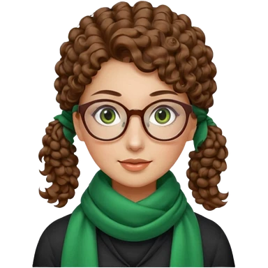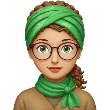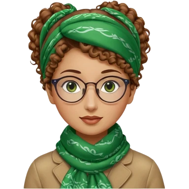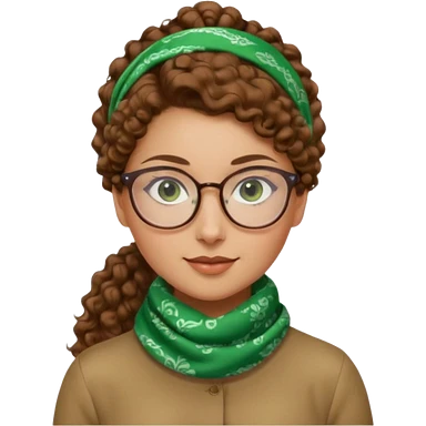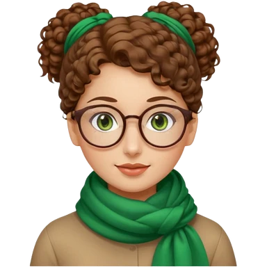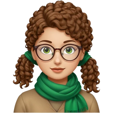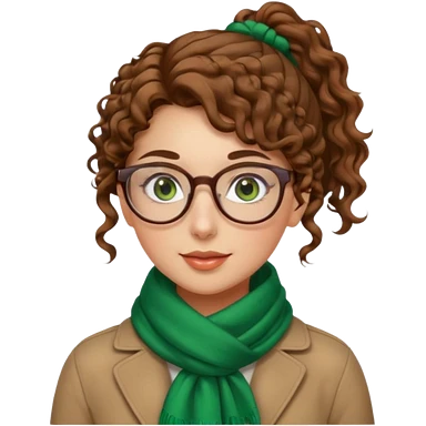 iranian woman, tight curly light brown hair in one high pony tail, glasses, green eyes, pretty, oval shape face, no hajib, scarf on neck emoji