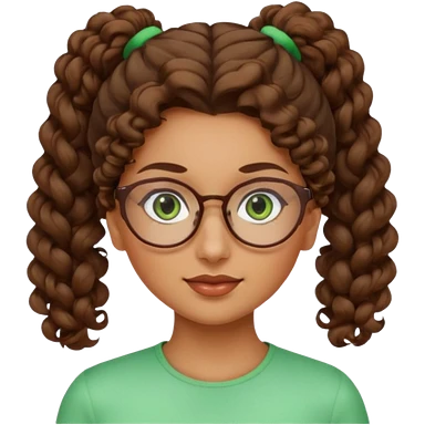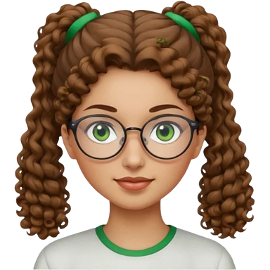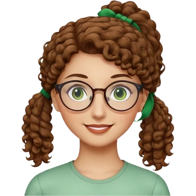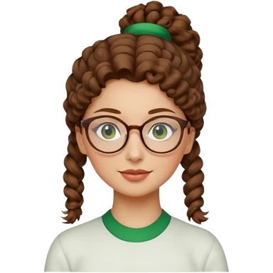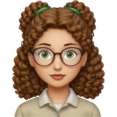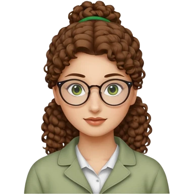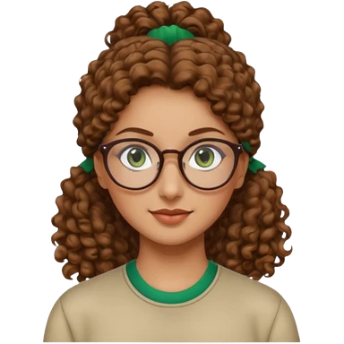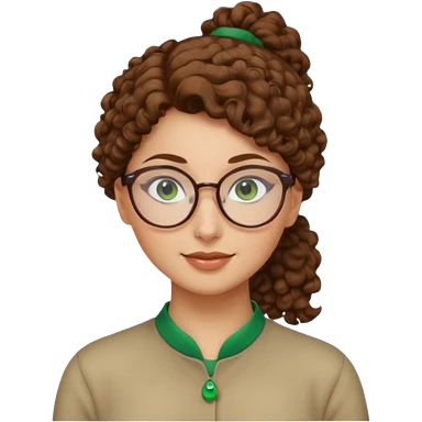 iranian woman, tight curly light brown hair in one high pony tail, glasses, green eyes, pretty, oval shape face emoji