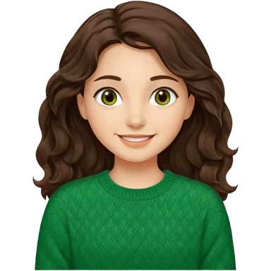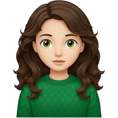 Una chica güera con pelo ondulado, café oscuro, largo, ojos cafés oscuros y con suéter o camisa verde emoji