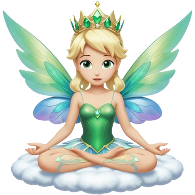 Isolated, 3D rendering, Tinkerbell wuth futuristic ultra detailed iridescent wings, full body view, center of image, sitting on a fluffy white cloud, blonde beautiful hair, tiara head piece, emerald green blue eyes, still life, futuristic vivid colors emoji