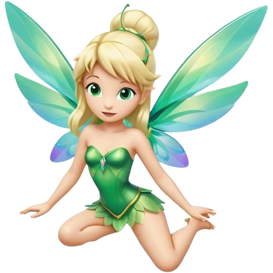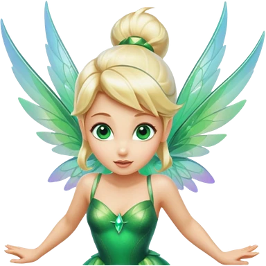 Isolated, 3D rendering, Tinkerbell wuth futuristic ultra detailed iridescent wings, flying mid-air, blonde beautiful hair, emerald green eyes, emoji