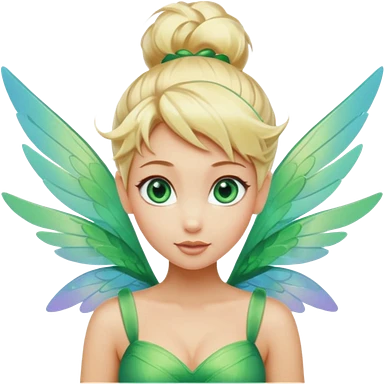 Isolated, rendering, modern Tinkerbell wuth futuristic iridescent color wings, flying above fluffy white clouds, blonde beautiful hair in messy bun, emerald green eyes, still life, vivid colors emoji