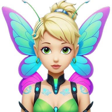 Isolated, 3D rendering, Tinkerbell cyberpunk futuristic style, ultra detailed vibrant colored wings, a one piece cyberpunk neon color outfit, playing with a detailed butterfly emoji