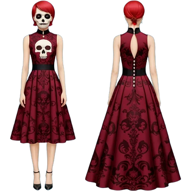 No human figures, Women's Skull Print Evening Dress in Oxblood, sleeveless evening dress featuring an all-over fiery red Skull print. High neck with button fastening, isolated, rendering emoji