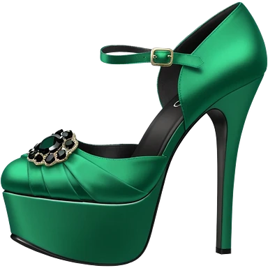 isolated side view, 3D rendering, emerald green satin, chunky platform heels with sparkling black color rhinestone in center emoji