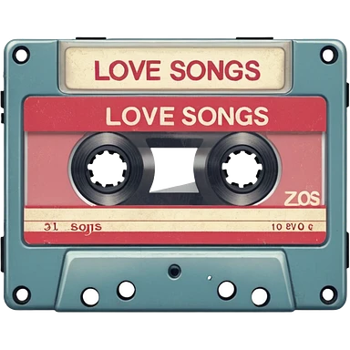 Isolated, rendering, vintage style music cassette tape, vintage appearance white label that reads "love songs" on front emoji