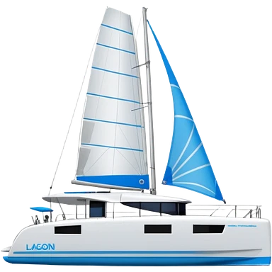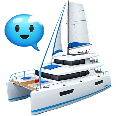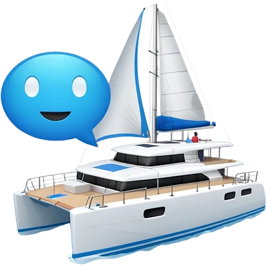 a lagoon 42 catamaran with no wording on the boat and an i message chat bubble icon coming out the top of the boat emoji