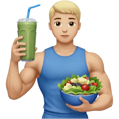 A young male person with a muscular, well-defined build. He has short blonde hair, a light skin tone, and a neutral facial expression. He wears blue cloth. He is holding a salad in one hand and a protein shake in the other. emoji