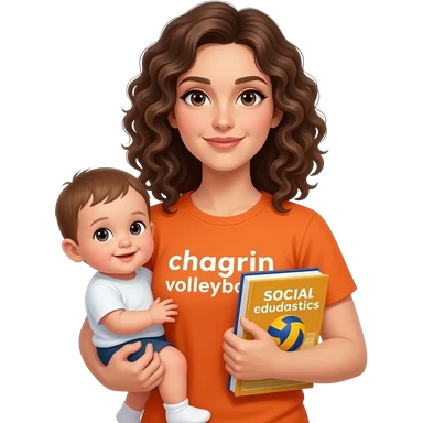 italian women with curly/wavy hair. Tall and she has a social studies book in her hand. She is wearing a orange shirt that says chagrin volleyball on it. holding a baby emoji