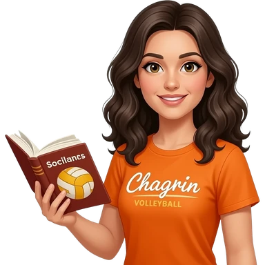 italian women with curly/wavy hair. Tall and she has a social studies book in her hand. She is wearing a orange shirt that says chagrin volleyball on it. emoji