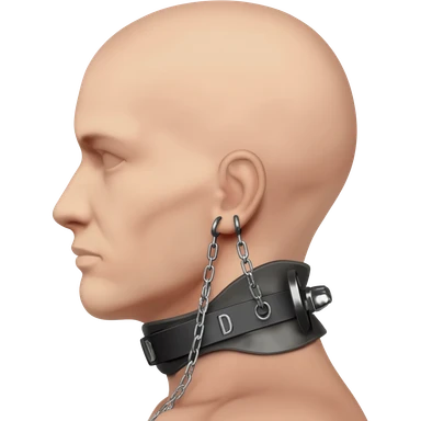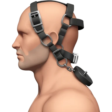 Side profile with neck fully extended back, showing defined neck fibres and a prominent Adam’s apple. Wearing a neck training brace with D-rings near the ears, with a chain running through a weight plate attached to the rings. emoji