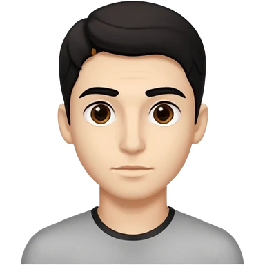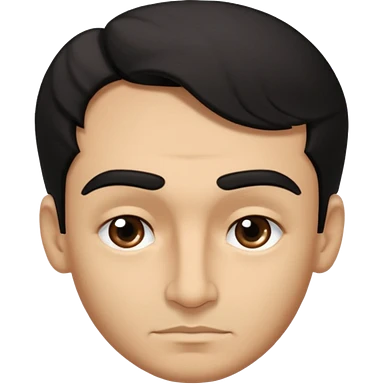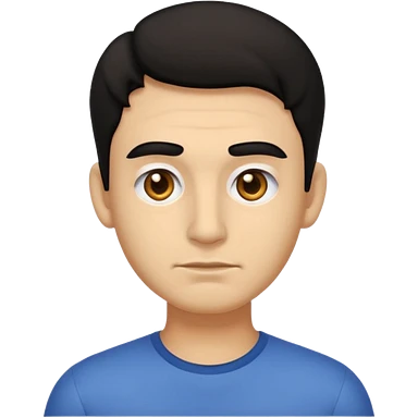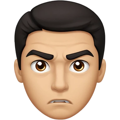 emoji de un joven, con cejas gruesas que parece enojado, nariz medio grande, hombros anchos, sin sonrisa, hombros anchos, cabello medio ondulado con un corte juvenil, cabello negro. ojos negros. emoji