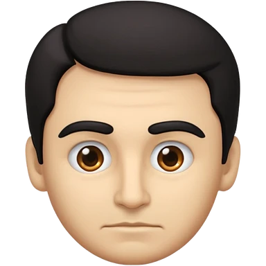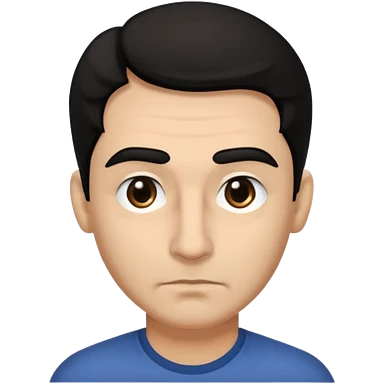 emoji a medio cuerpo, de un hombre, con cejas gruesas inclinadas hacia abajo, nariz medio grande, hombros anchos, sin sonrisa, hombros anchos, cabello medio ondulado con un corte juvenil, cabello negro. ojos negros. emoji