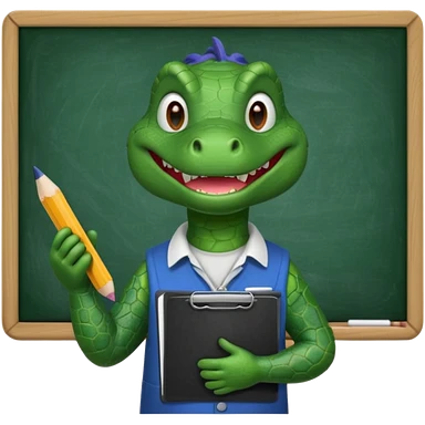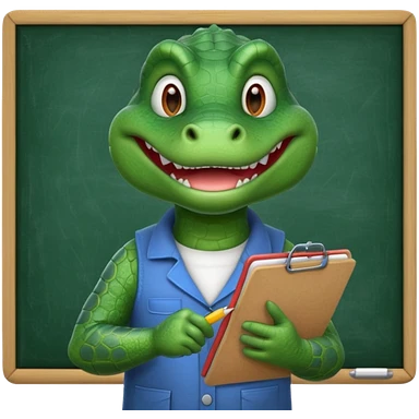 A 1960s style image of a gator with a clipboard and a pencil in front of a chalkboard emoji