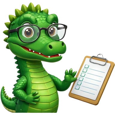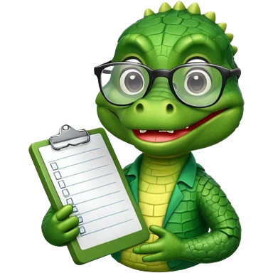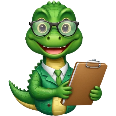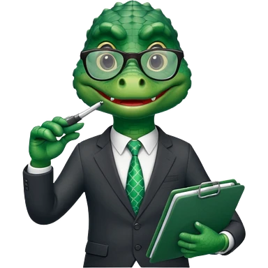 A cartoon alligator in a business suit with a clipboard and glasses emoji