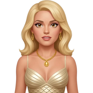 Honey Ryder from James Bond with hazel eyes, long blonde hair, ivory metallic mermaid dress, gold necklace, earrings emoji