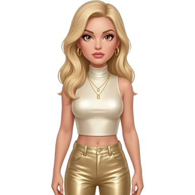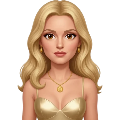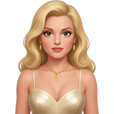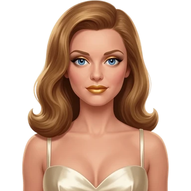 Gwendolyn Gann from James Bond Series with blue eyes, gold lipstick, ivory eyeshadow, long golden brown hair, ivory metallic sweetheart dress emoji