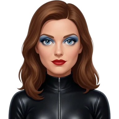 Emma Peel from James Bond Series with blue eyes, red lipstick, periwinkle eyeshadow, long brown hair, black metallic turtleneck jumpsuit emoji