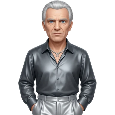 Ernst Stavro Blofeld from James Bond with blue eyes, silver hair, charcoal grey metallic shirt, light gray metallic baggy pants, silver necklace emoji