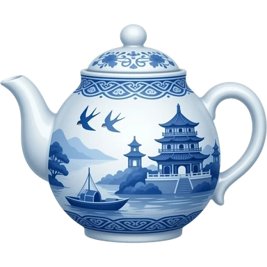 chinoiserie blue willow china pattern teapot with a boat, pagodas and two swallows emoji