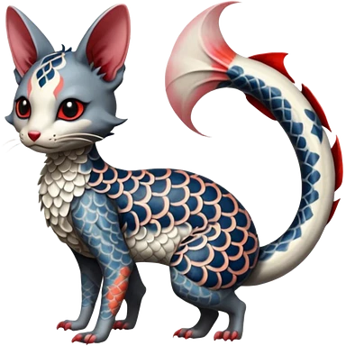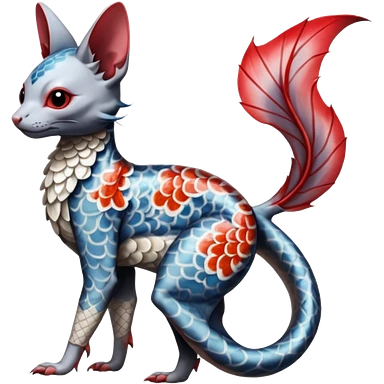 Japanese oriental Asian Edgy badass swimmy wet painted intricate ornate Japanese Asian koi-Minccino-Lykoi-Emolga-Sphynx-Linoone-Zangoose-fusion-hybrid-animal-Fakémon-creature, full body, thin long sleek scaly tail, intricate markings emoji